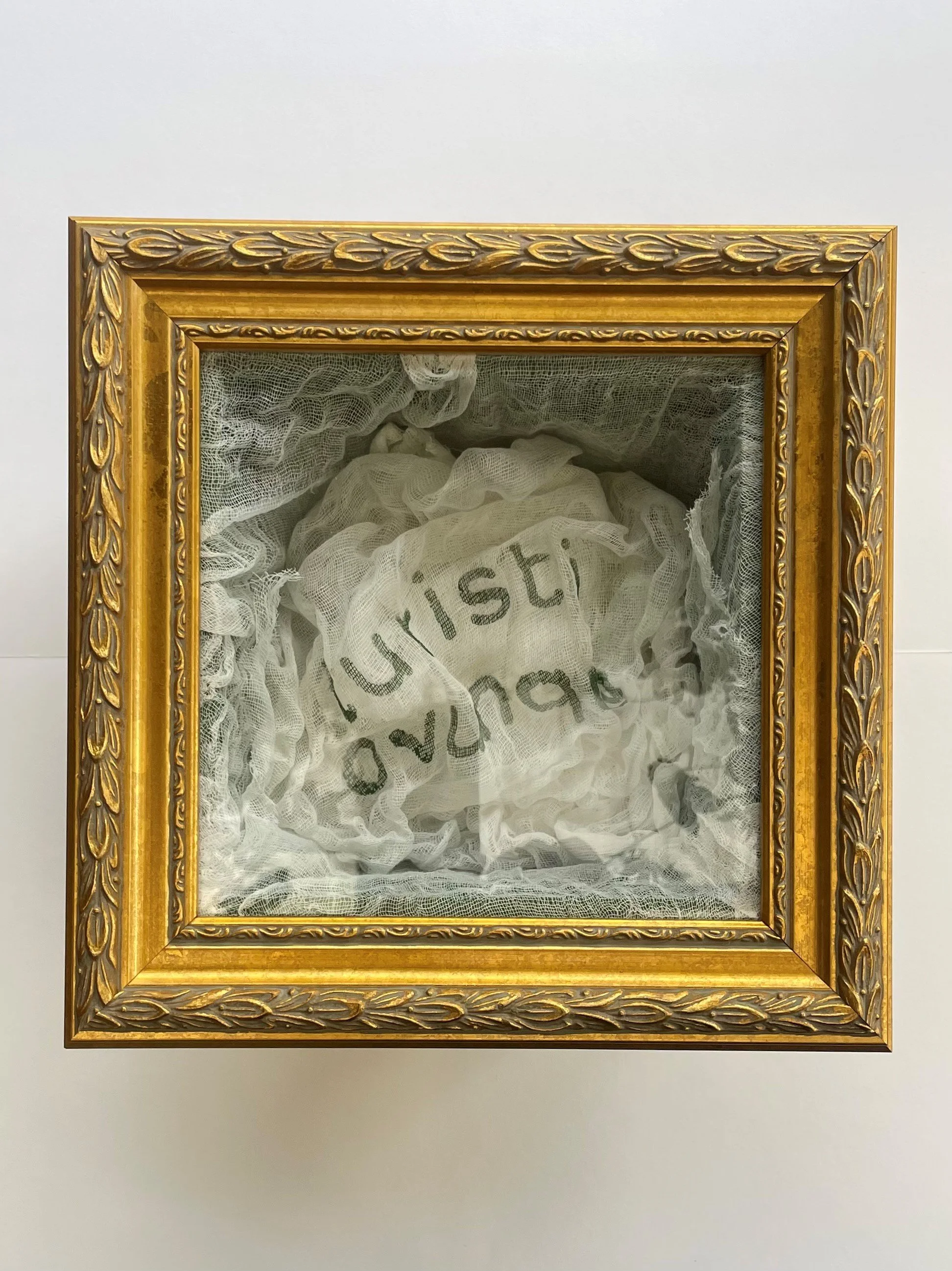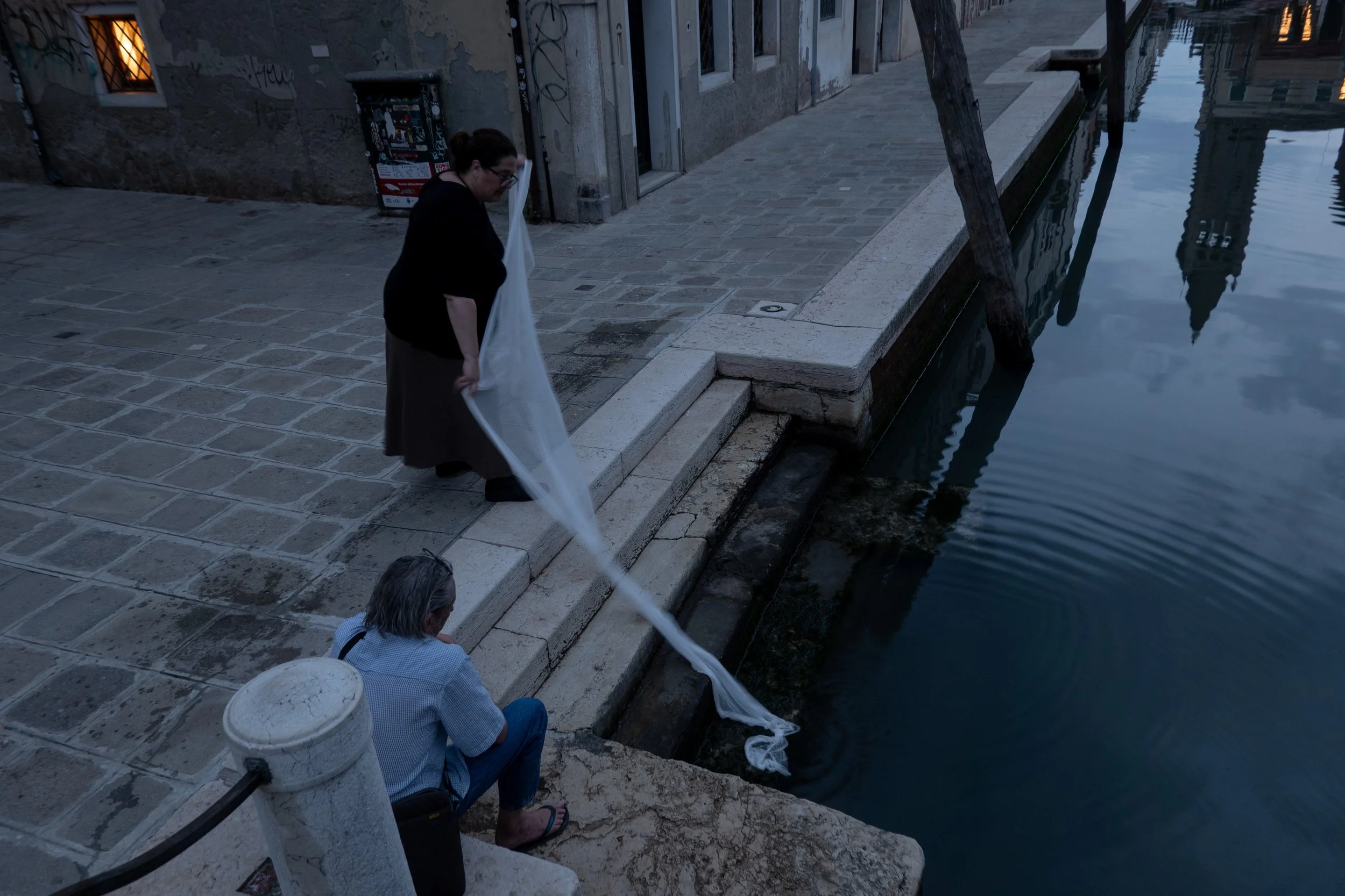Drenched veil, Venetian canal residue, gilded frame, 2025