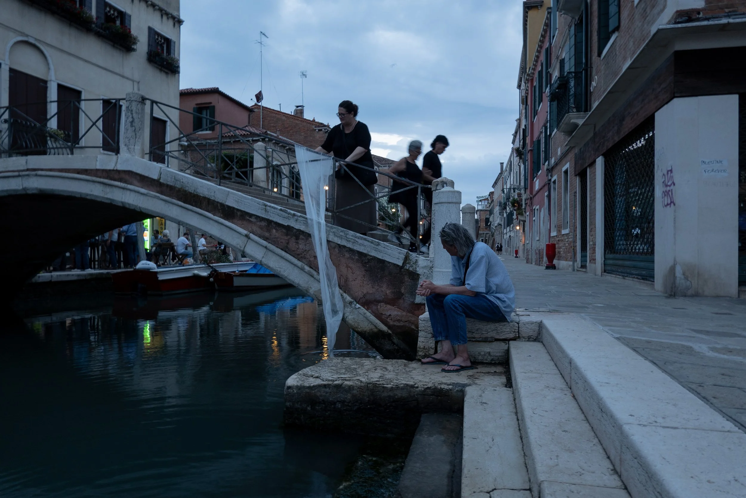 A veil, immersed and dragged through the canal waters, absorbs residue, sediment, churn, and human trace, becoming an artefact of both contamination and beauty. The performative elements of this gesture were recorded on site, marking the work’s genesis as both action and artefact.