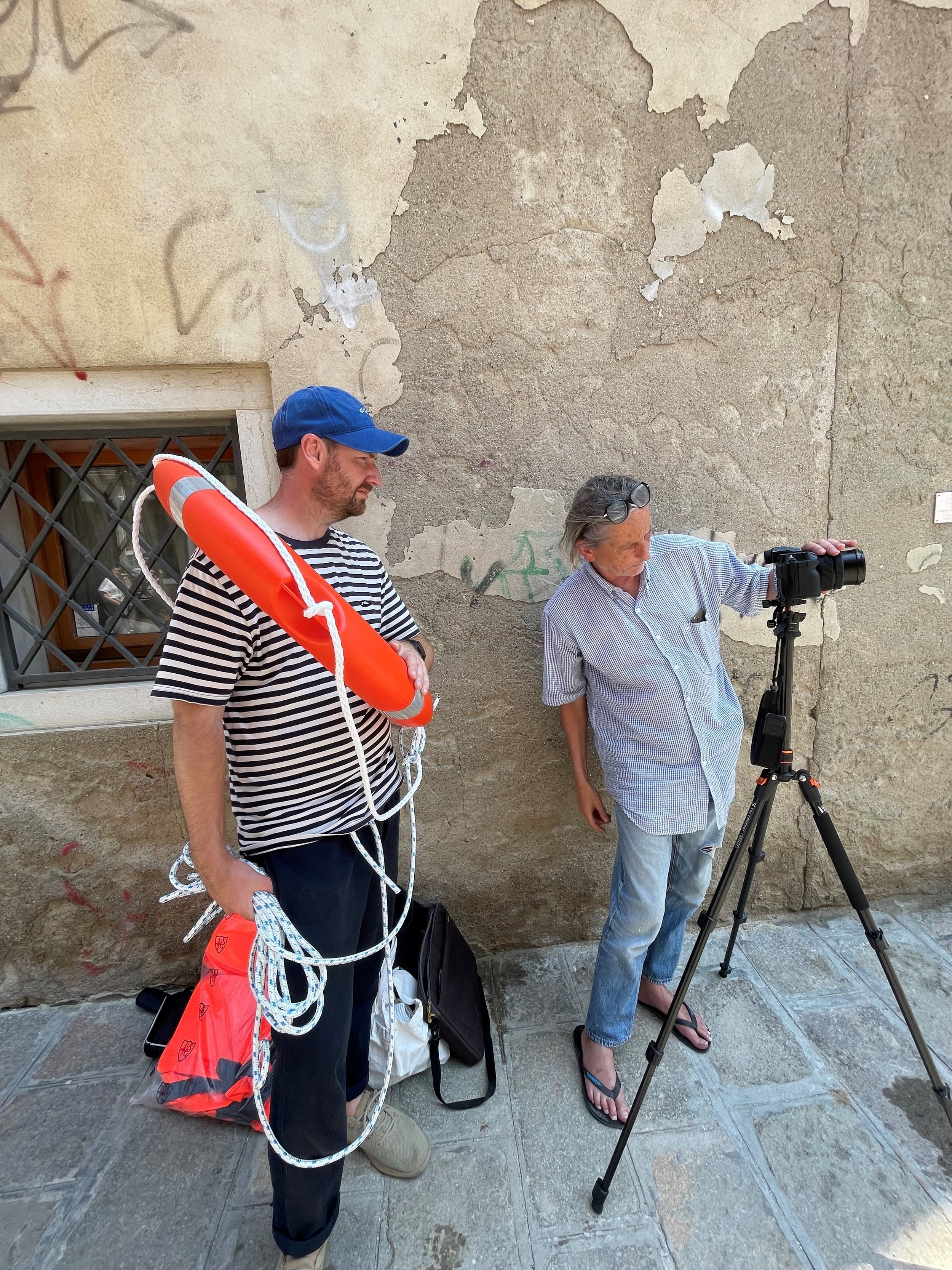 From these shared provocations, three video works emerged. One followed a turista crossing the Rialto Bridge in a life jacket, a strange and quiet alarm amid the flow of tourists. Another reimagined the DOGE’s ring ceremony with a salvagente, a bright orange, ring shaped, life buoy, flung from the Bridge of Fists in a gesture both playful and political. The third tracked emergency boat lights flickering through dry alleyways, signaling disorientation, urgency, and collapse.