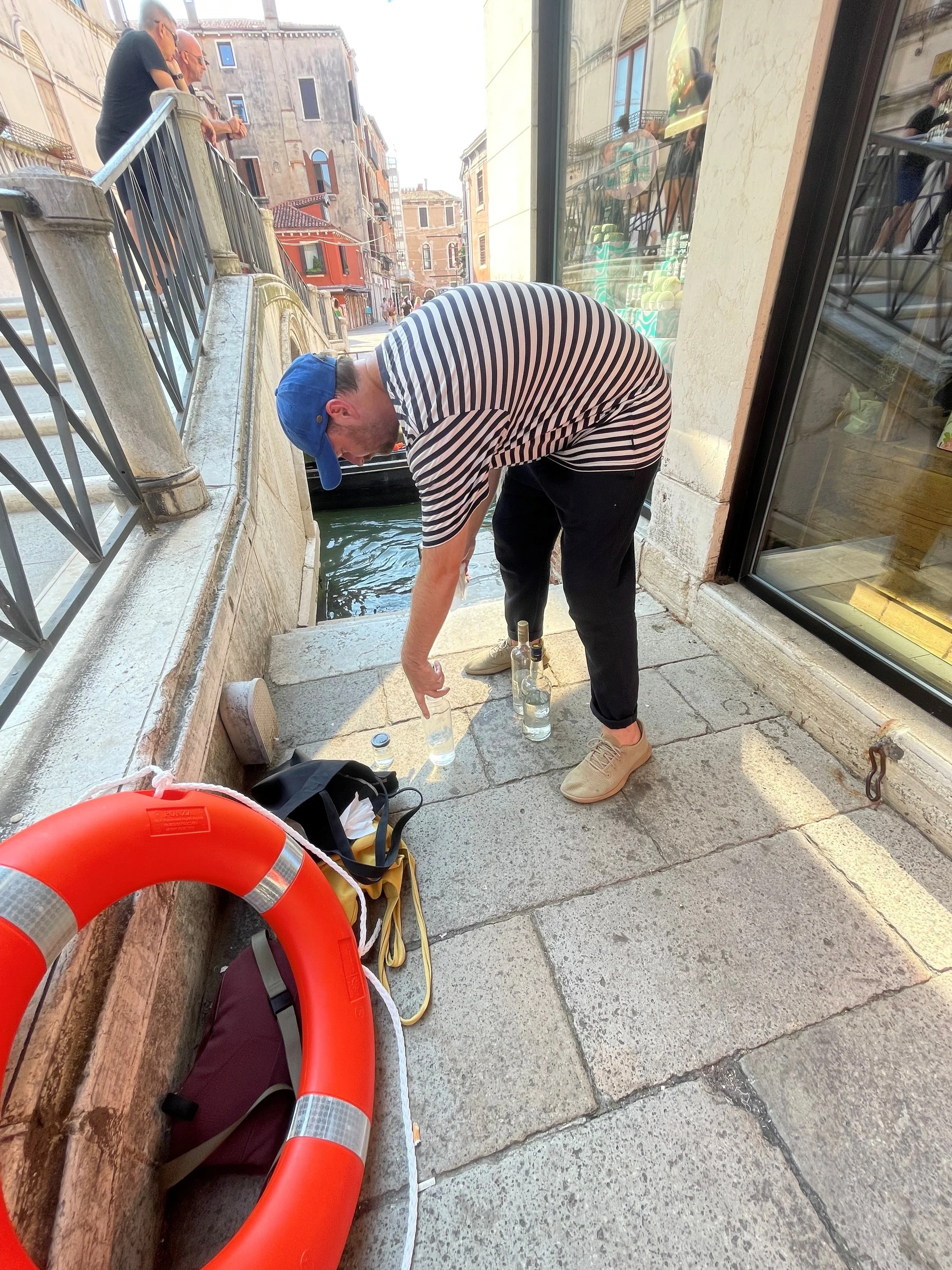 The objects from these performances were not discarded. Instead, they were reassembled alongside other locally sourced objects into a sculptural installation titled ‘arte preserva’ - both precarious and poetic, in the spirit of arte povera. A life buoy, gilded timber scavenged from a boatyard, salvaged Venetian bricks, spritz liquor bottles, and water taken directly from the canal - all stacked in delicate tension. Not stable. Not safe. A fragile monument to survival, that could go under at any moment